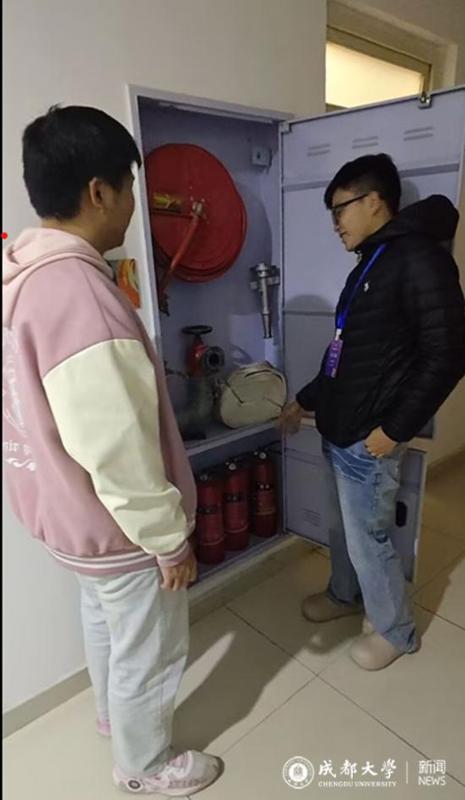 让检查组意外的是,16栋30多间寝室全“过关”:没有电暖器、电热杯,连充电宝都拔了线;有的桌上整整齐齐,插线板旁还贴着手写的“人走断电”便签。公共区域的消火栓、灭火器也都状态好,封签日期是最新的11月17日,压力表指针稳稳停在绿色安全区。