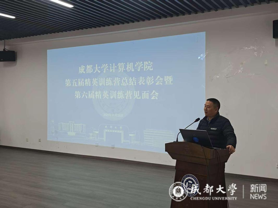 精英训练营负责人吴奇峰在会议上对第五届精英训练营进行了系统总结。过去一年中,训练营在竞赛成果、科创能力培养、项目实践与组织建设方面均取得重要突破:第五届精英训练营成员整体获奖率达到 83% ,其中国家级奖项占比 30%,多名营员在专业赛事中崭露头角;在黄色漫画