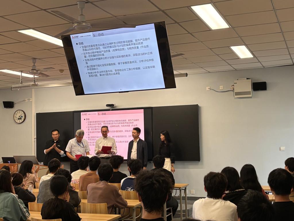 讲座中,两位高管结合三菱电机软件在行业内的丰富实践,围绕软件产品全生命周期质量管理体系、核心技术应用及行业发展趋势等内容展开深入分享,通过案例分析与互动问答,帮助学生们搭建起理论知识与产业需求的桥梁,现场学习氛围浓厚。